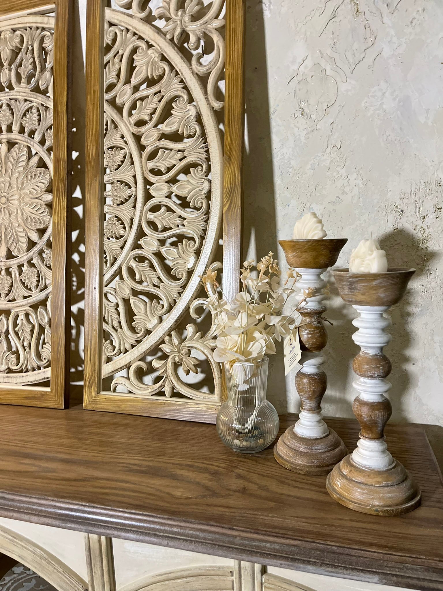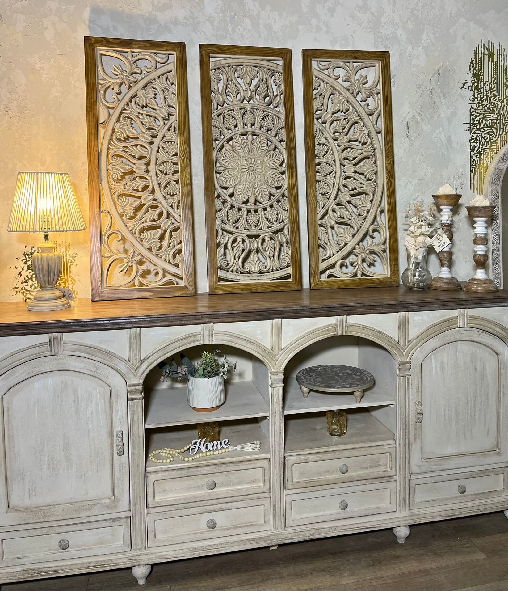 حوّل أي جدار إلى نقطة تركيز فنية مع هذه القطعة الجدارية الخشبية المميزة. تتكوّن من ثلاث لوحات متناسقة بتفاصيل زخرفية متداخلة تشكّل تصميمًا دائريًا متكاملًا عند تجميعها. الإطار الخشبي الطبيعي يضفي دفئًا وأناقة، بينما تضيف النقوش المفرغة لمسة فنية عصرية تعزز ديكور المساحات الداخلية.
