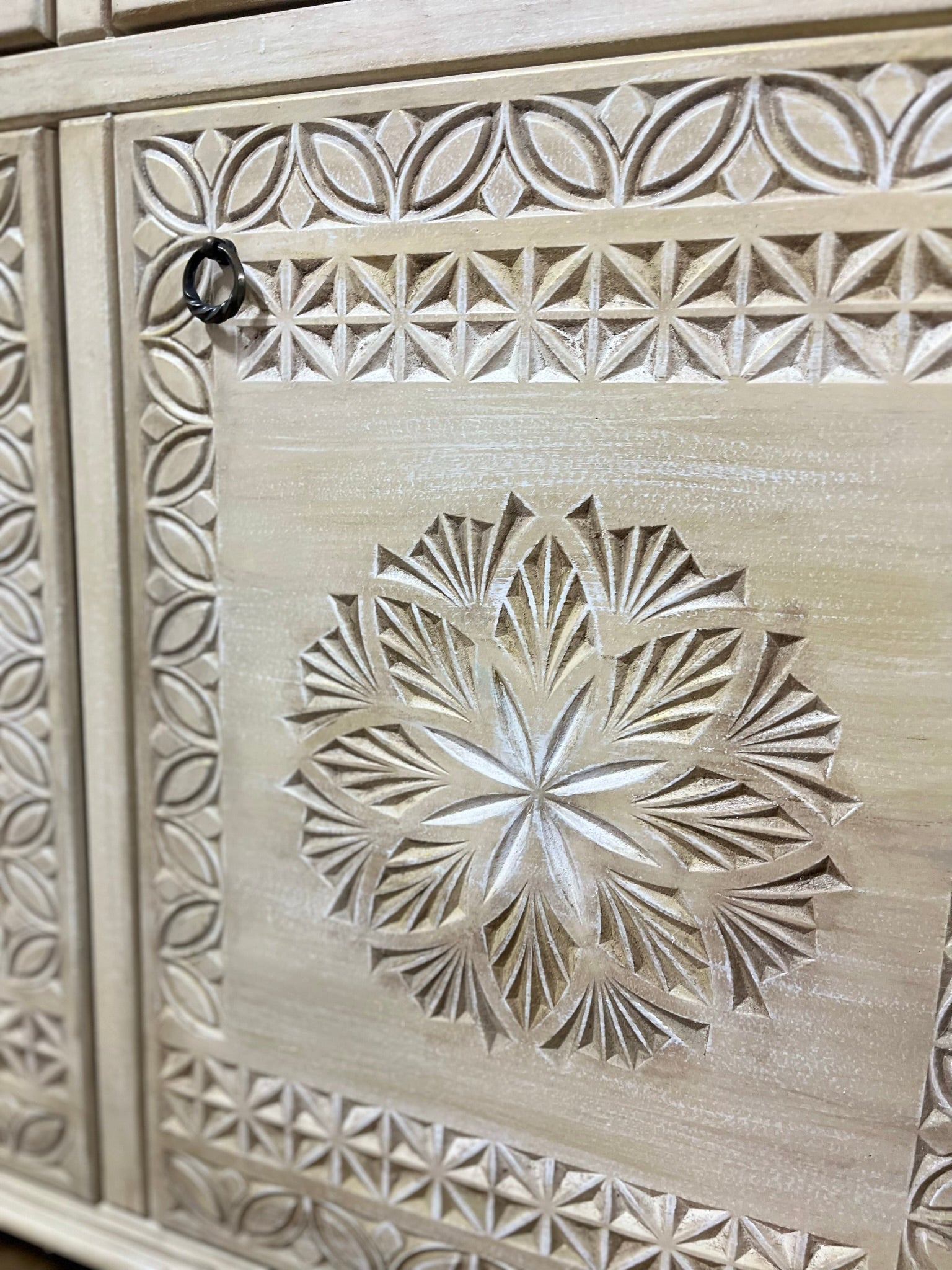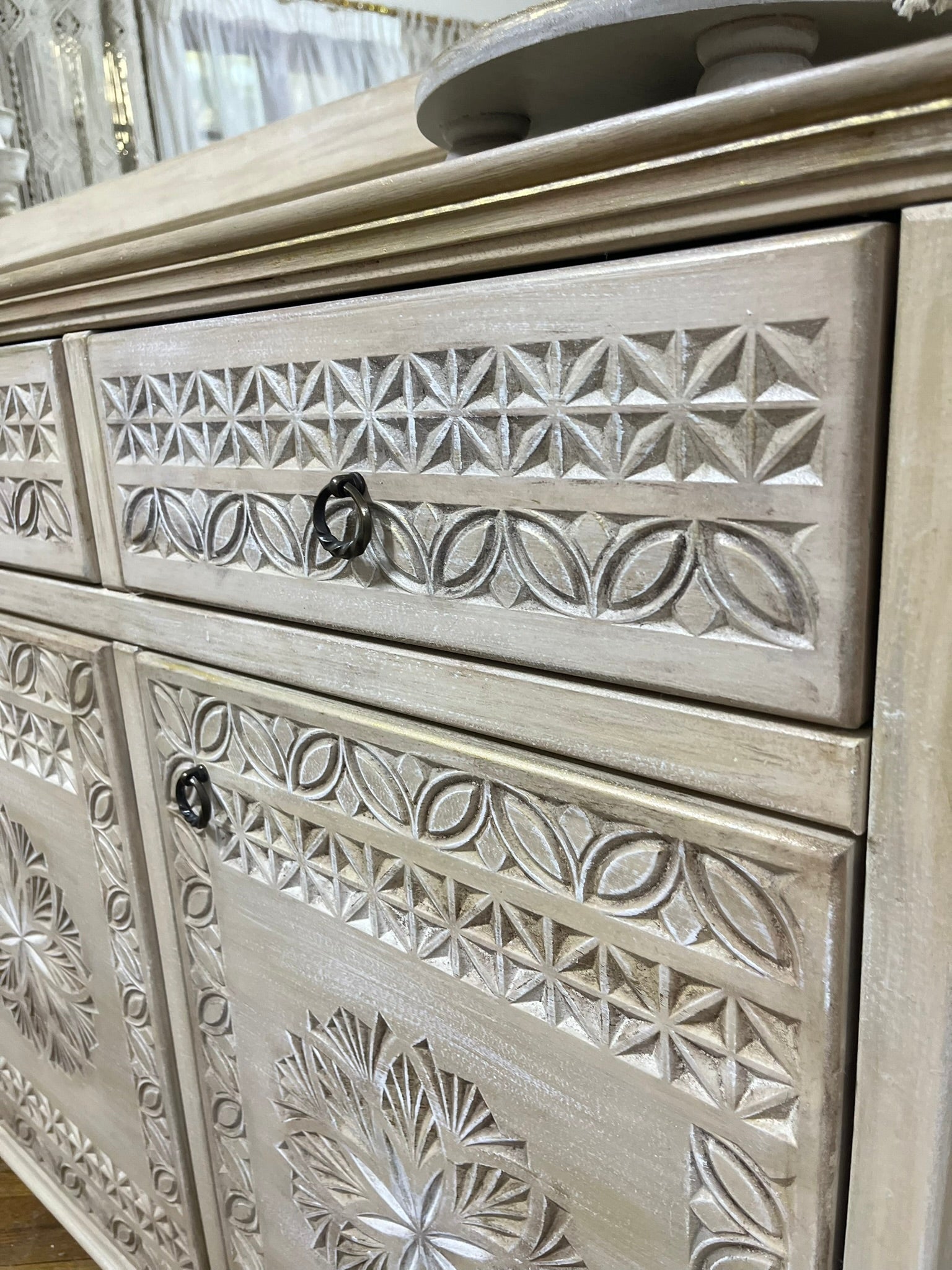 Elegant buffet cabinet with intricate carved detailing, offering generous and functional storage space.