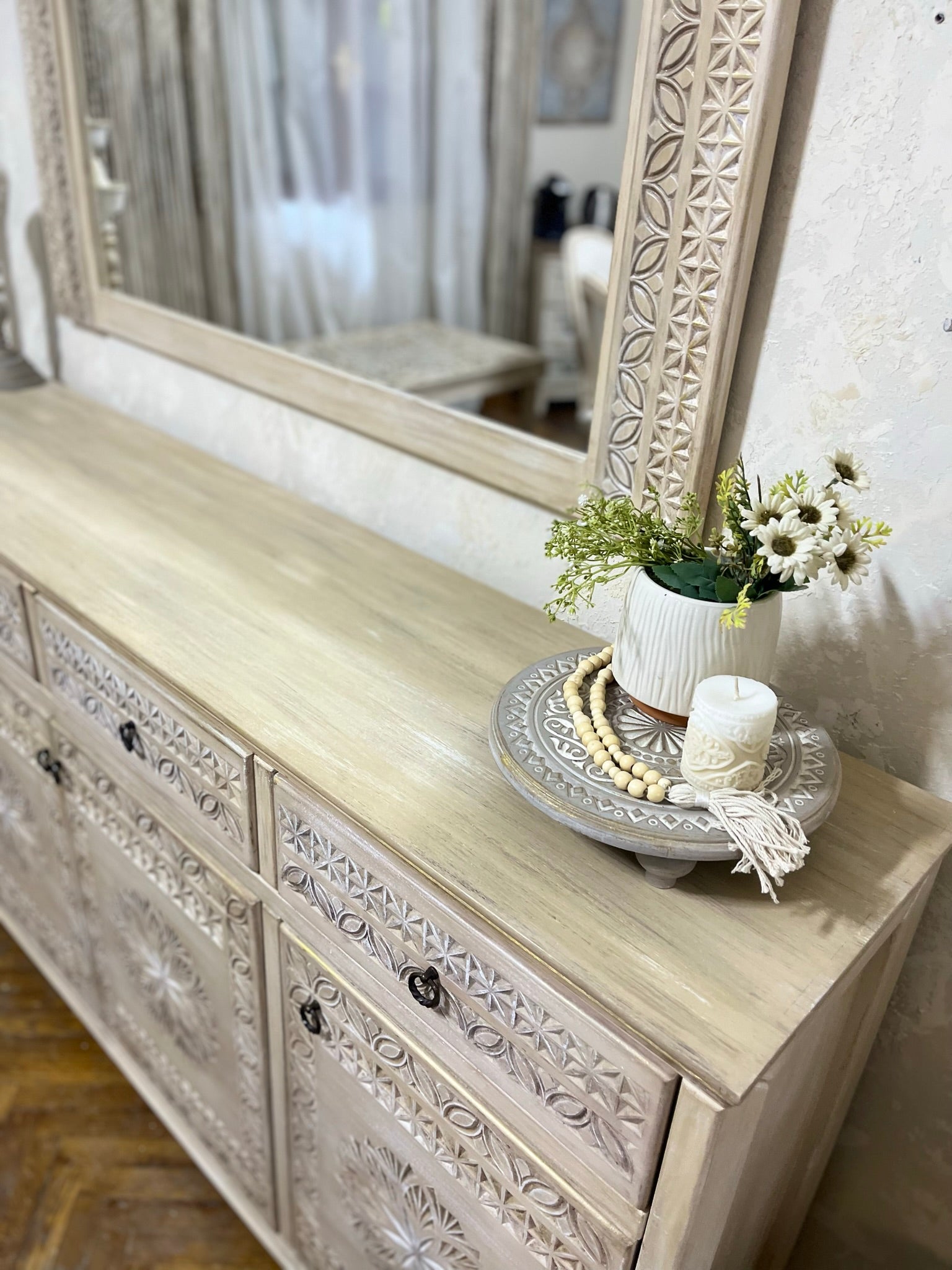 بوفيه أنيق بتفاصيل محفورة تضيف لمسة فنية مميزة، يوفر مساحة تخزين واسعة وعملية.