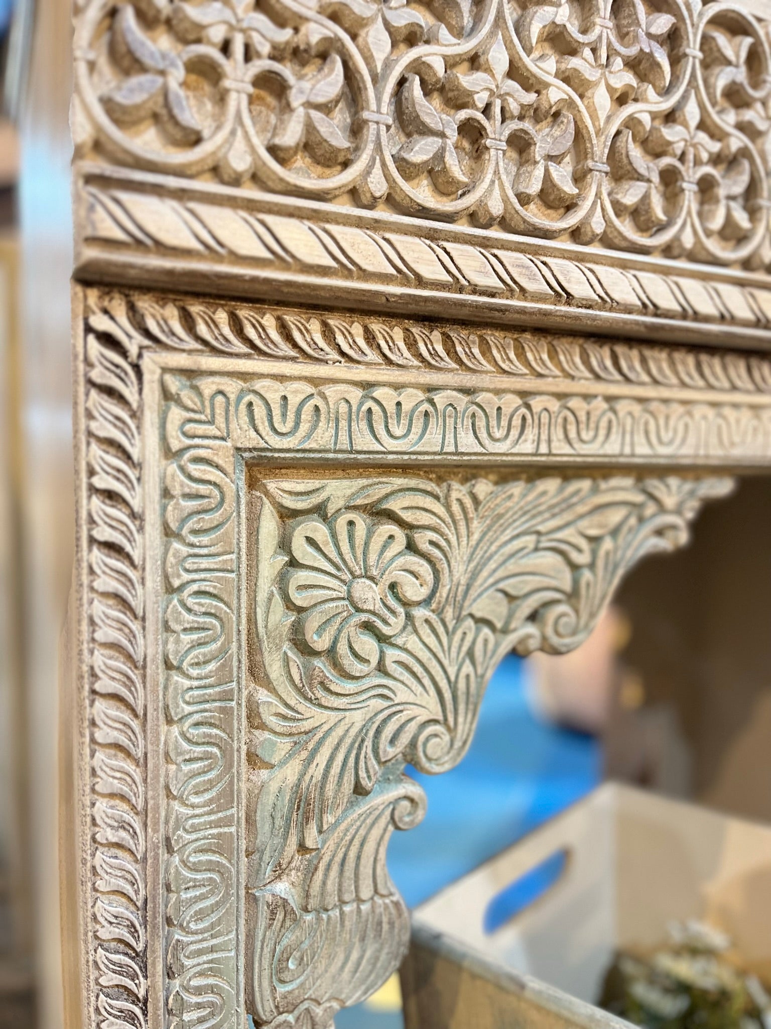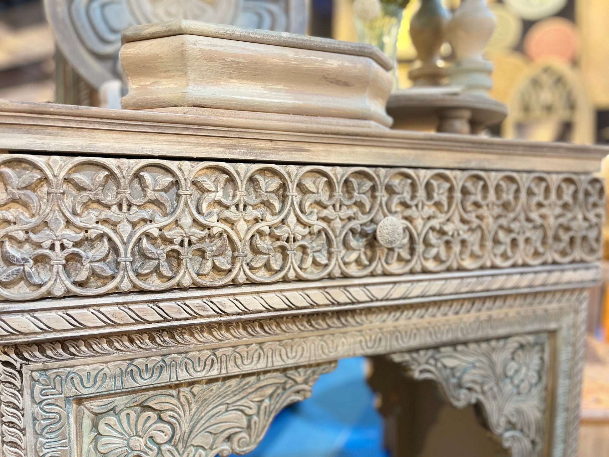 كونسول أنيق بتصميم شرقي مزخرف يضفي لمسة فنية فريدة على أي مساحة. يتميز بدرج عملي يمكن استخدامه لتخزين الأغراض الصغيرة، مع تفاصيل منقوشة دقيقة تضيف عمقًا وجاذبية للتصميم.