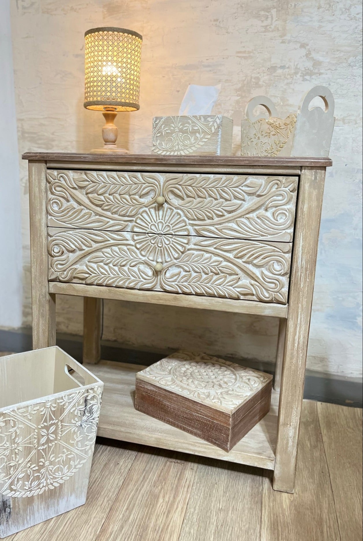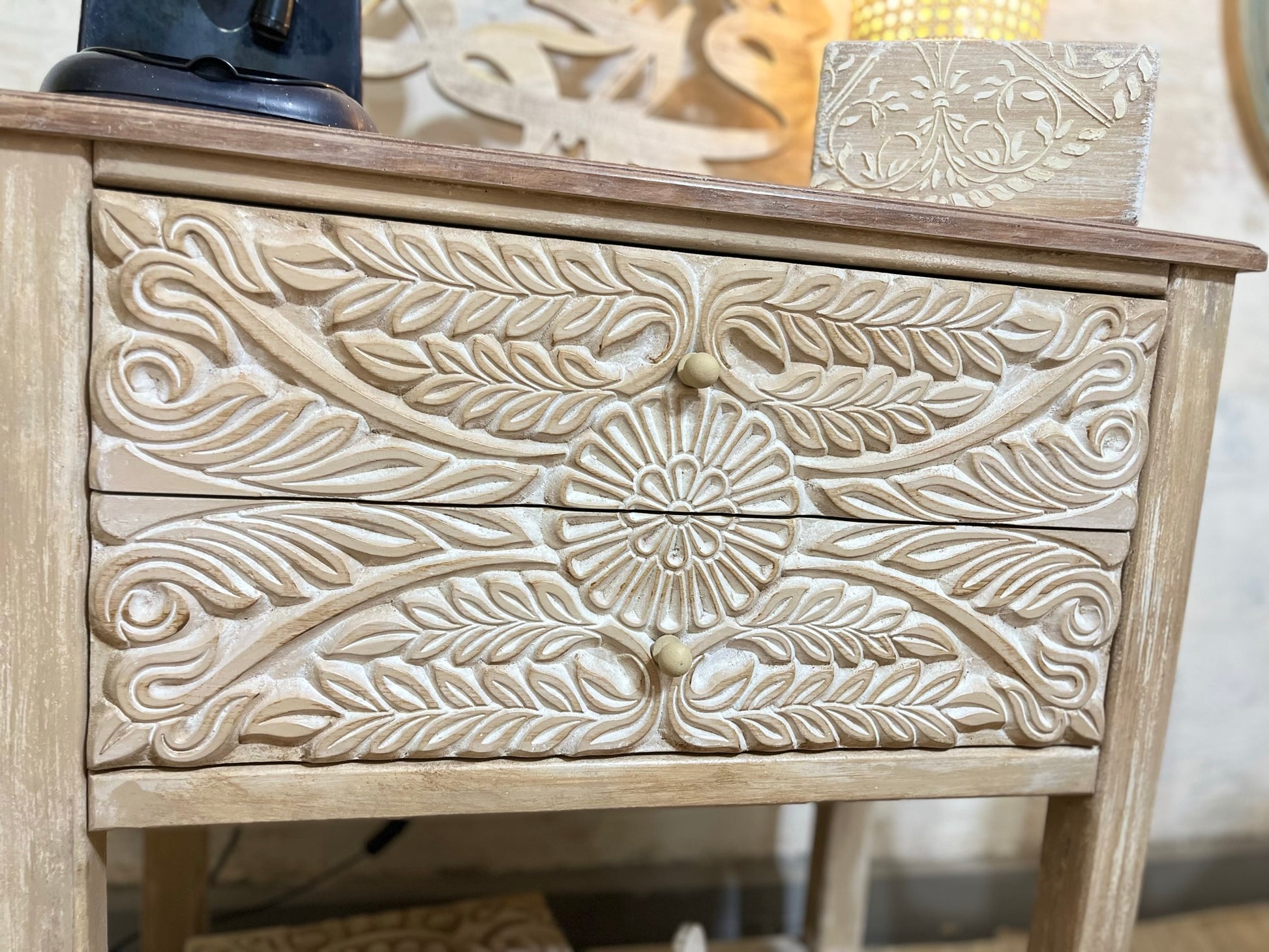 قطعة متعددة الاستخدامات يمكن توظيفها ككونسول أنيق أو زاوية لتحضير القهوة، بتصميم شرقي منقوش يمنحها لمسة فنية مميزة.