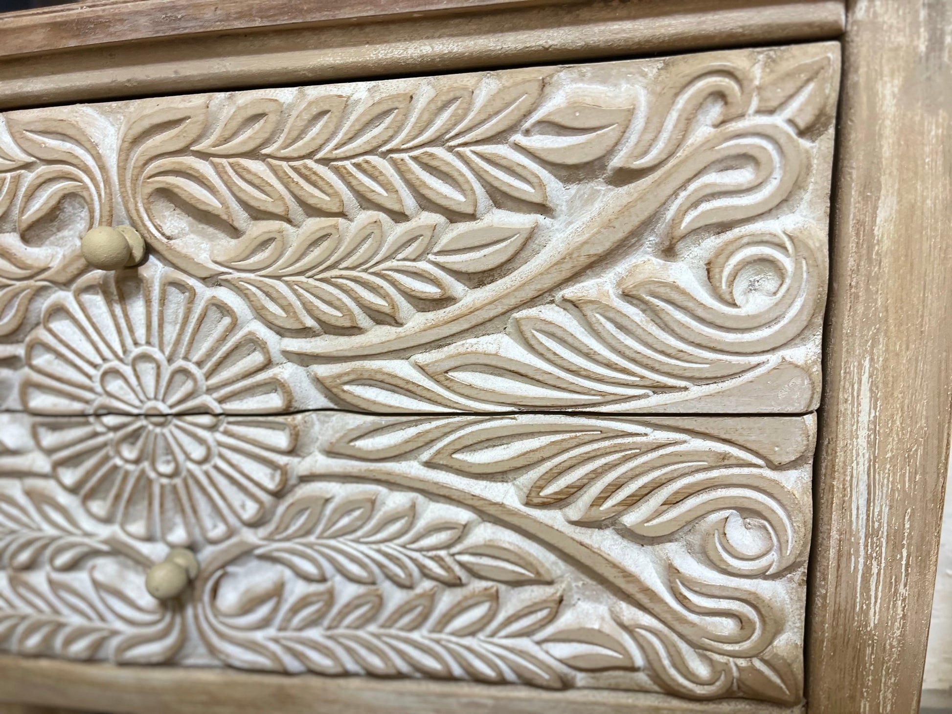 Features an intricately carved oriental design, with a spacious drawer and a bottom shelf for practical storage or display.
