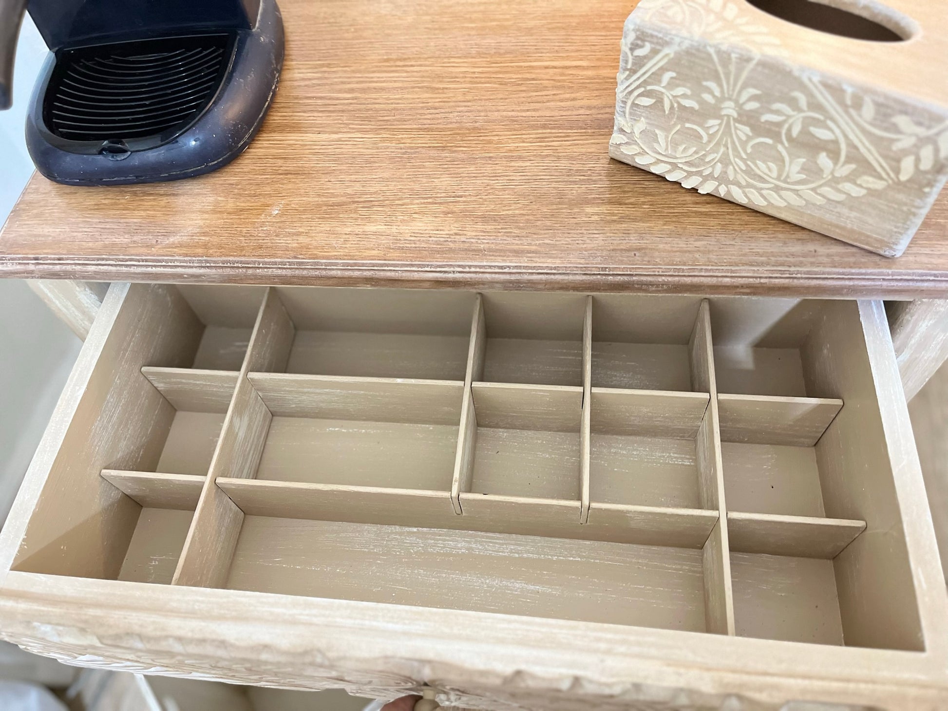 تحتوي على درج واسع مع رف سفلي عملي، ما يجعلها مثالية للتخزين أو تنسيق الإكسسوارات والقطع الديكورية.