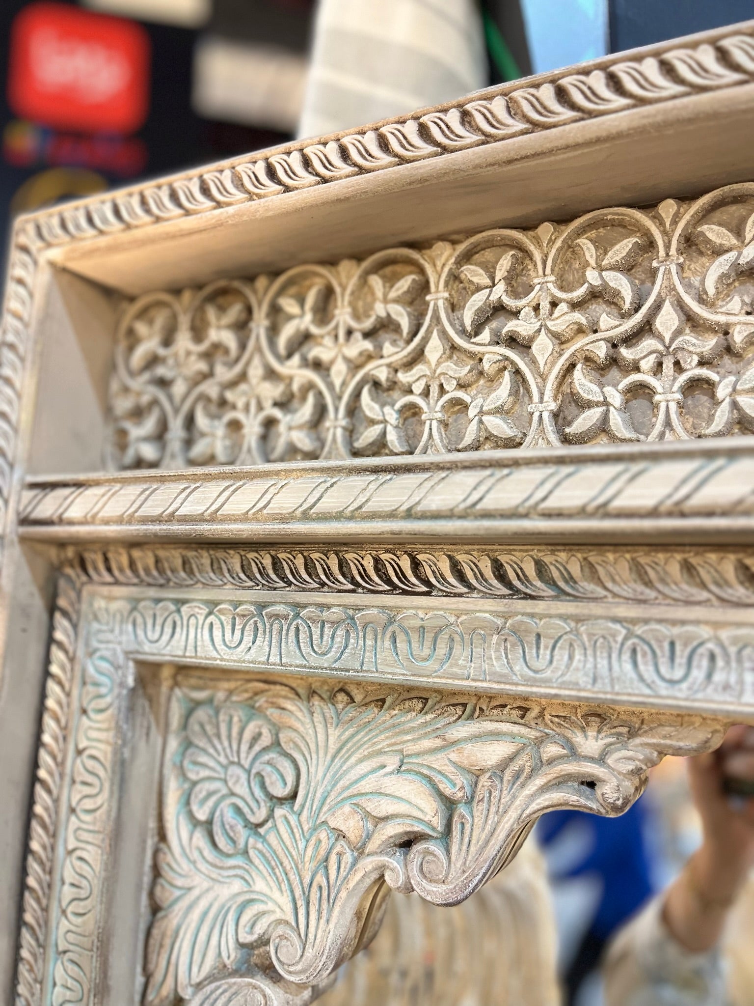 مرآة ديكورية كبيرة بتصميم شرقي فاخر، تتميز بإطار مزخرف بنقوش فنية تضيف لمسة تراثية مميزة لأي مساحة.