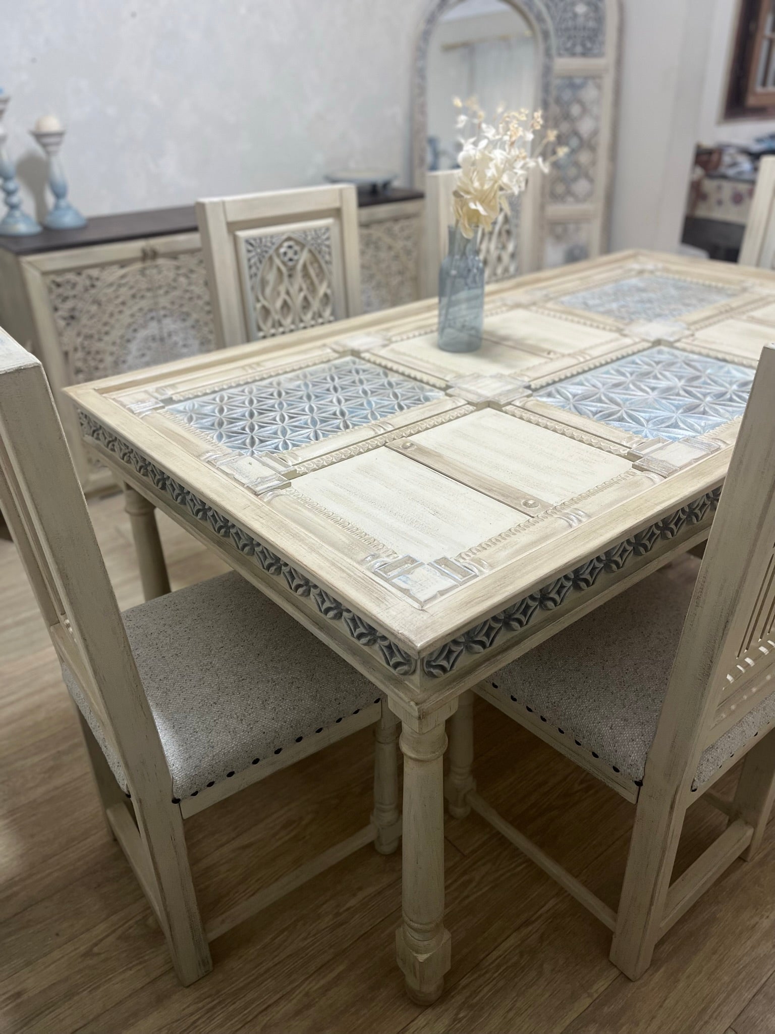 This dining set blends classic craftsmanship with soft tones and embossed ornamental detailing — a timeless centerpiece for your dining area.