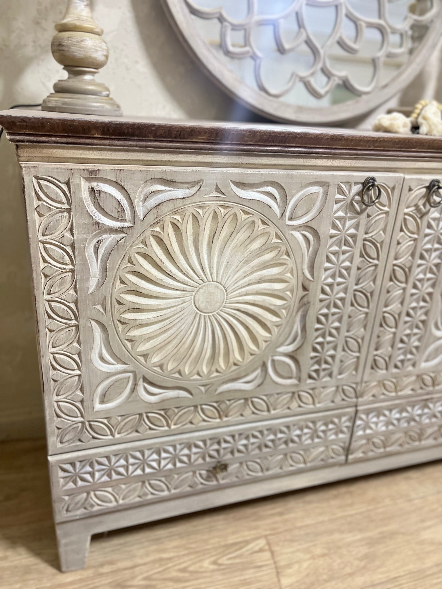 Elegant Storage Cabinet with Ornamental Details & Spacious Interior
