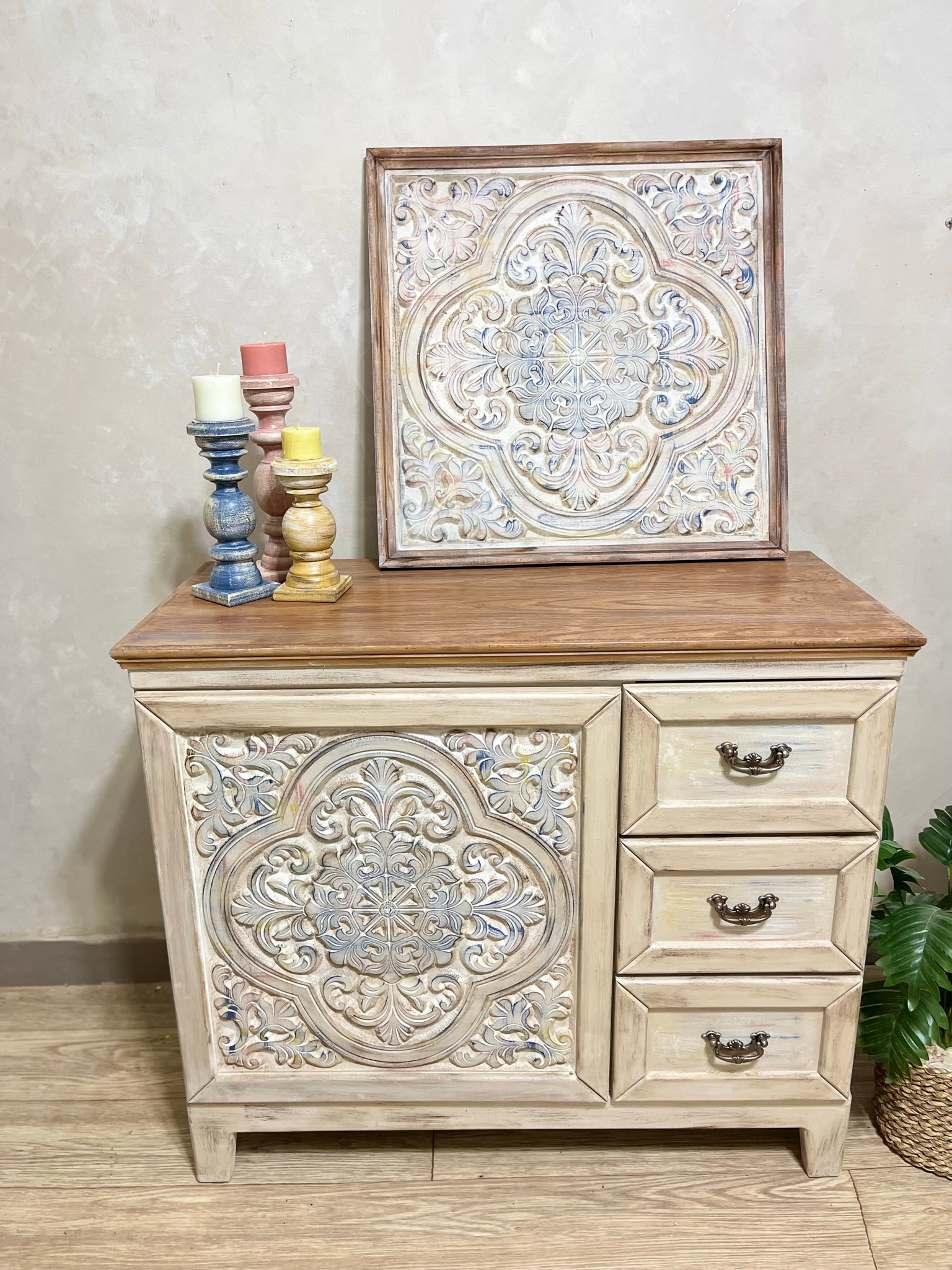Create a warm, inviting atmosphere with this versatile storage unit, paired with a round decorative wall piece (60 cm diameter). Whether used as a coffee corner, an entryway feature, or a stylish storage solution, this set brings functionality and art together in perfect harmony.