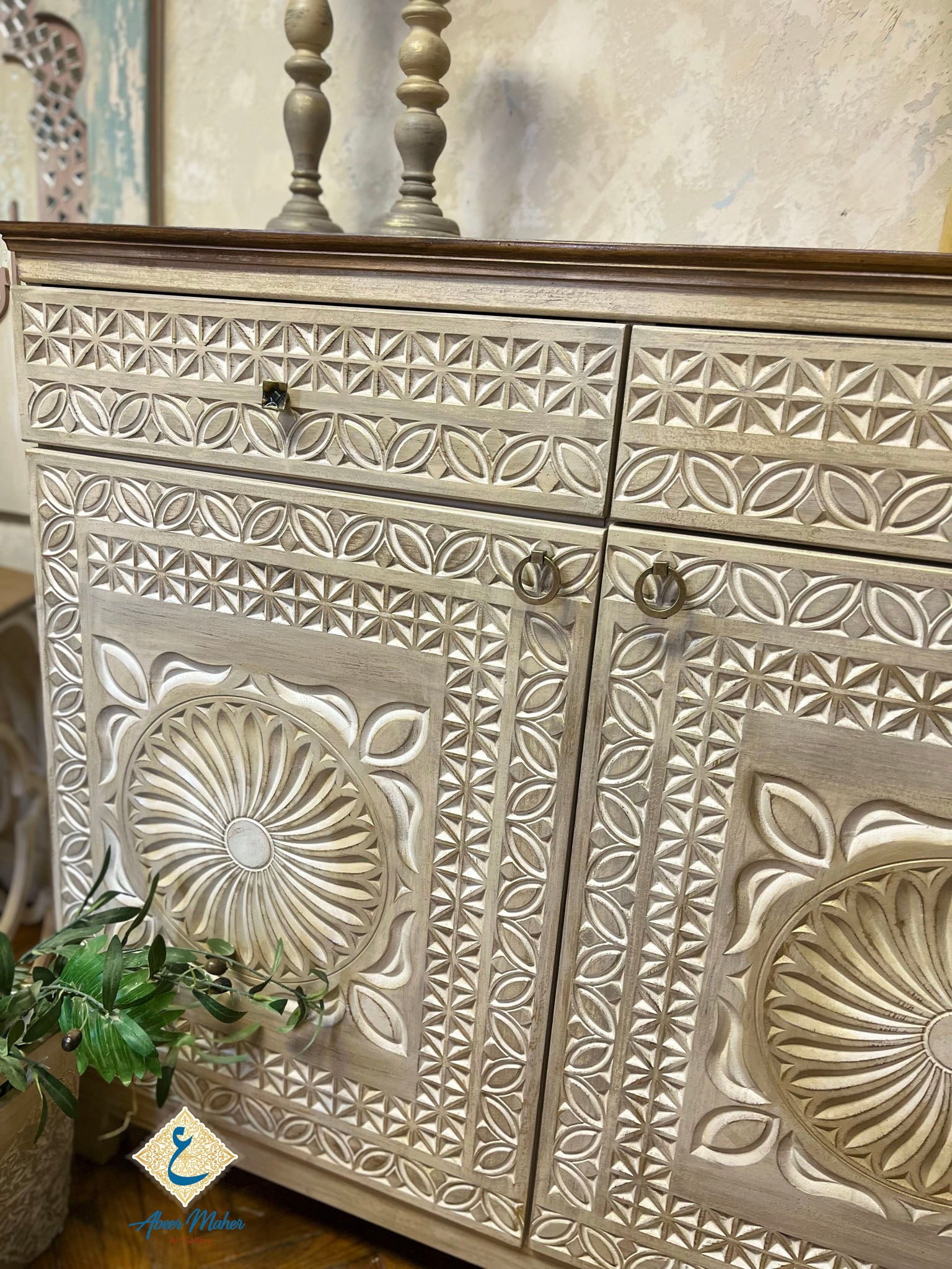 أضف لمسة من الفخامة والعملية إلى منزلك مع هذه الوحدة الخشبية متعددة الاستخدامات. تتميز بنقوش هندسية وزهرية بارزة تمنحها حضورًا بصريًا لافتًا، وسطح علوي مصقول يعزز أناقتها. تحتوي على أدراج علوية لتخزين الأدوات الصغيرة، وأبواب سفلية واسعة لتخزين الأغراض الأكبر.