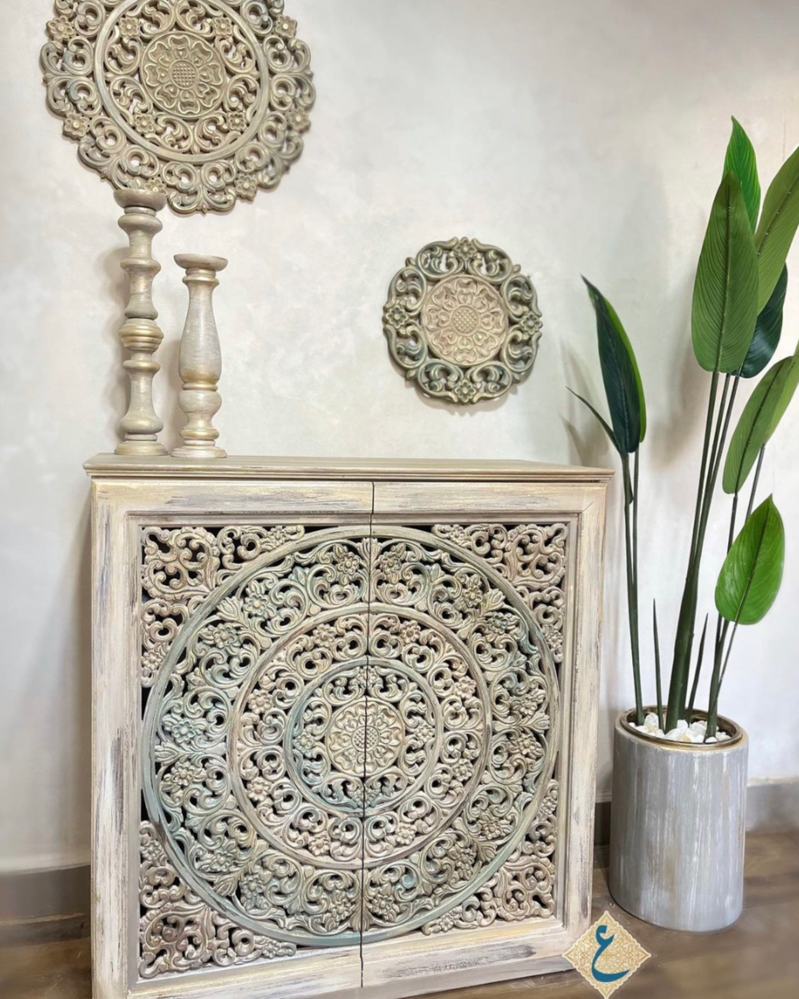 جزامة بتصميم شرقي أنيق، تتميز بواجهة مزخرفة بتفاصيل بارزة مصنوعة بتقنيات تصنيع دقيقة، مع تشطيب يدوي يمنح القطعة طابعًا فنيًا فريدًا ولمسة نهائية عالية الجودة.