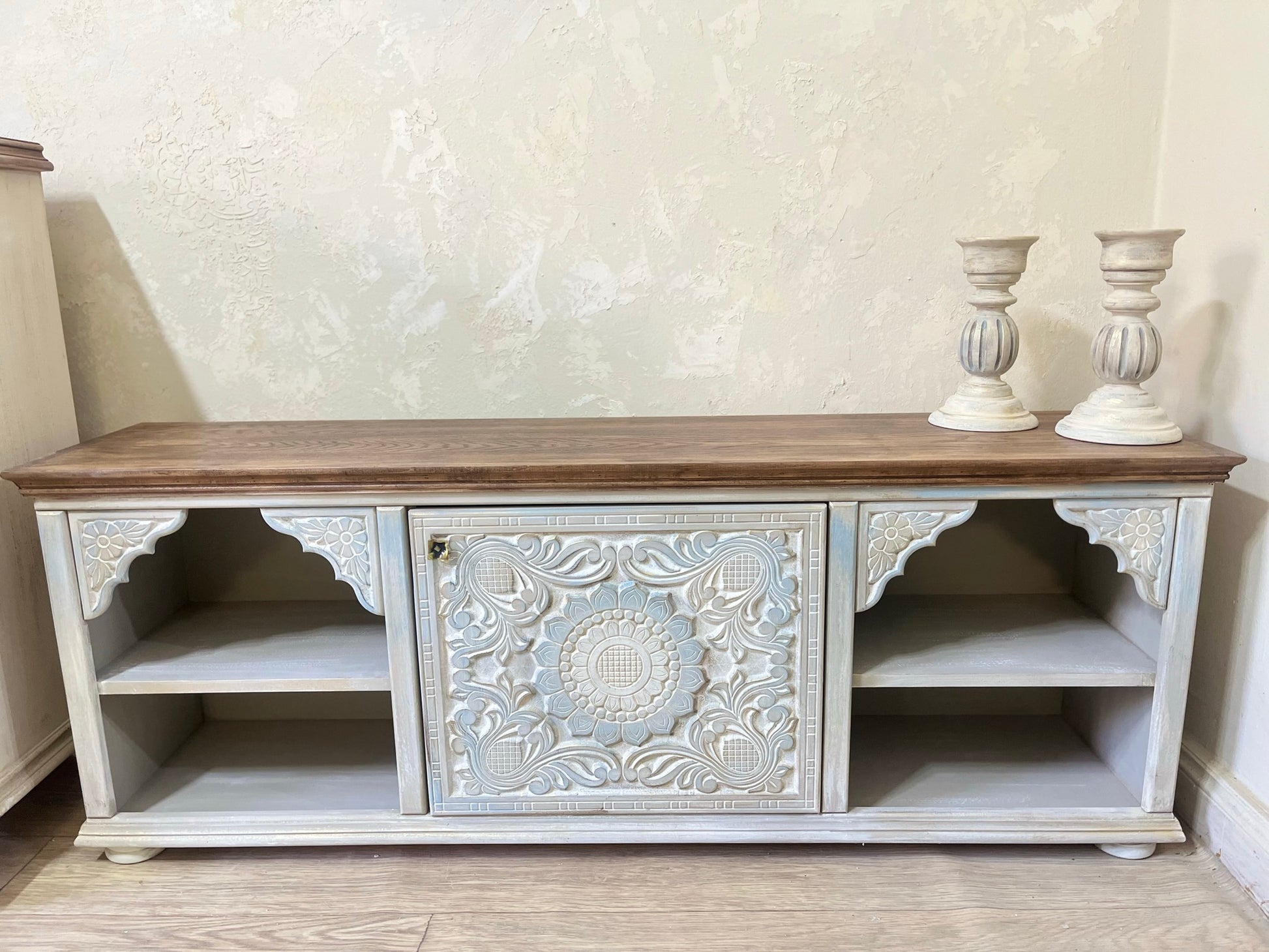Wooden TV unit with elegant decorative details and a hand-finished look that highlights its unique craftsmanship. Combines natural wood tones with white accents to suit various interior styles.