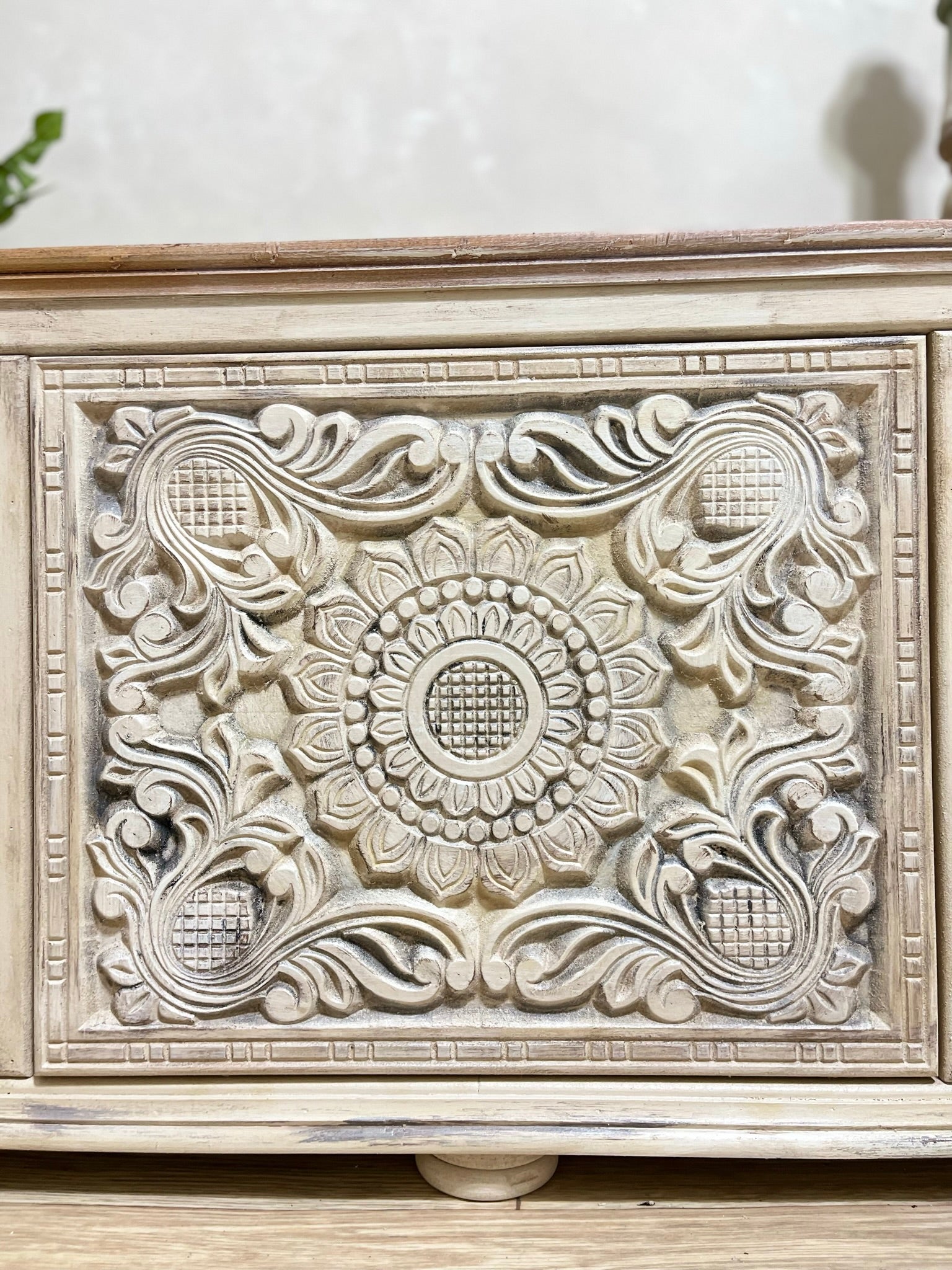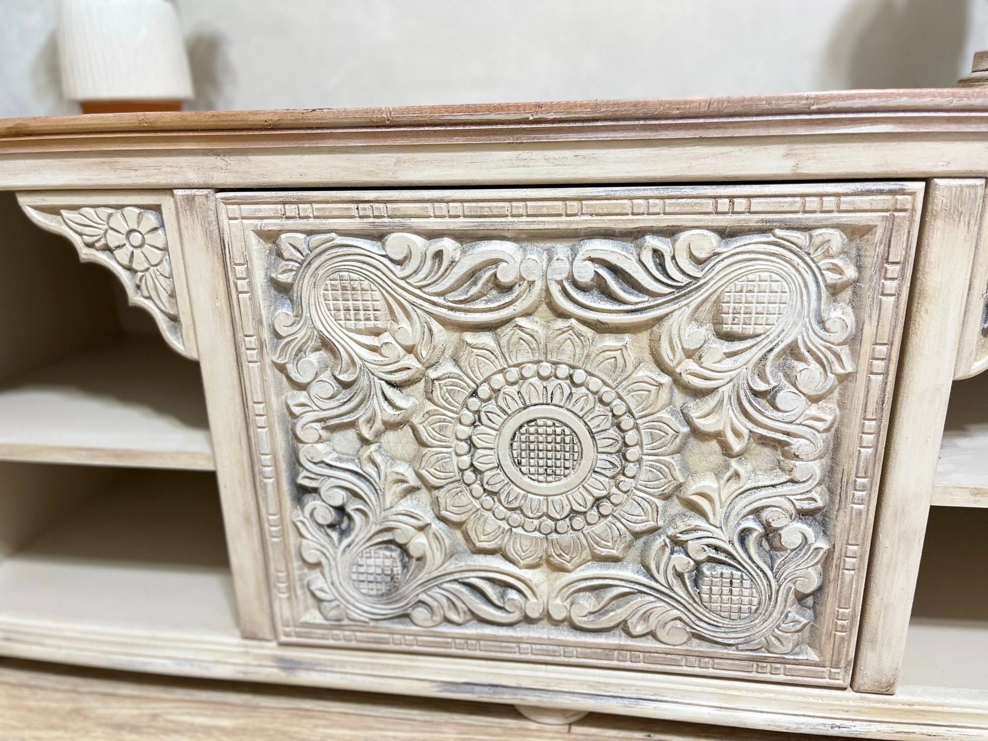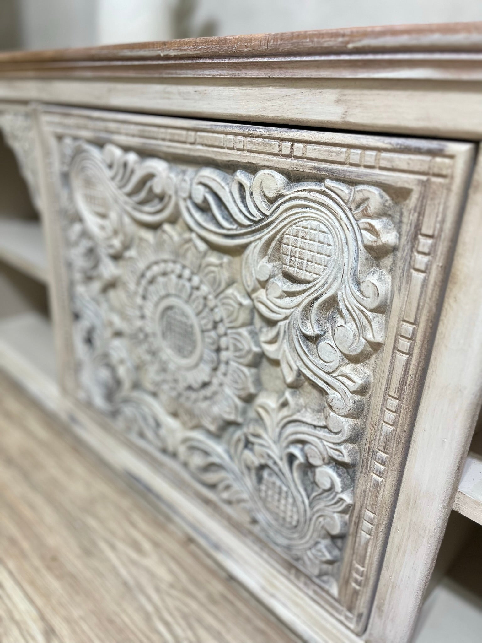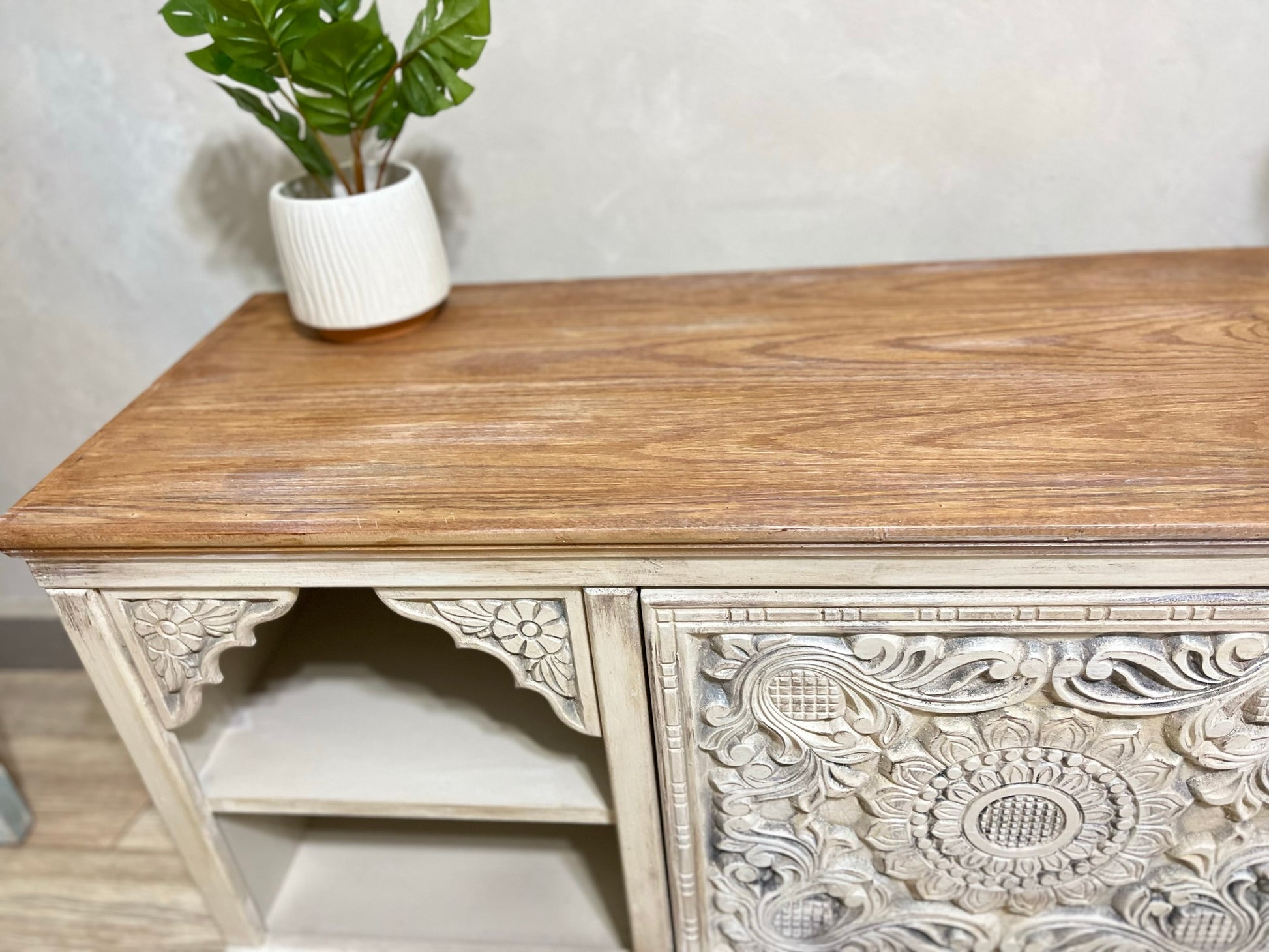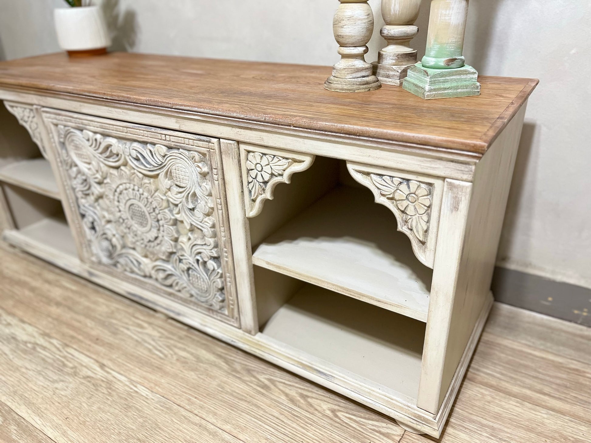 Wooden TV unit with elegant decorative details and a hand-finished look that highlights its unique craftsmanship. Combines natural wood tones with white accents to suit various interior styles.