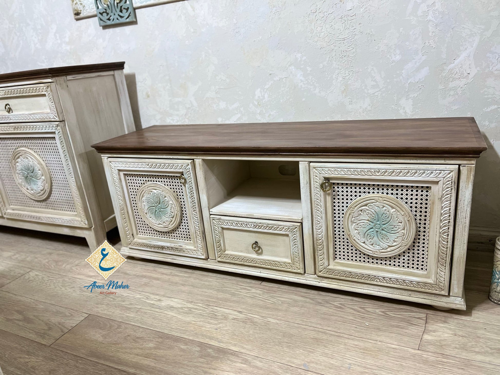 تتميز بواجهات مزينة بنقوش مميزة، مع استخدام الكانيه الطبيعي في الأبواب لإضفاء لمسة خفيفة وم透ّفة تعزز من الطابع الفني للقطعة.
