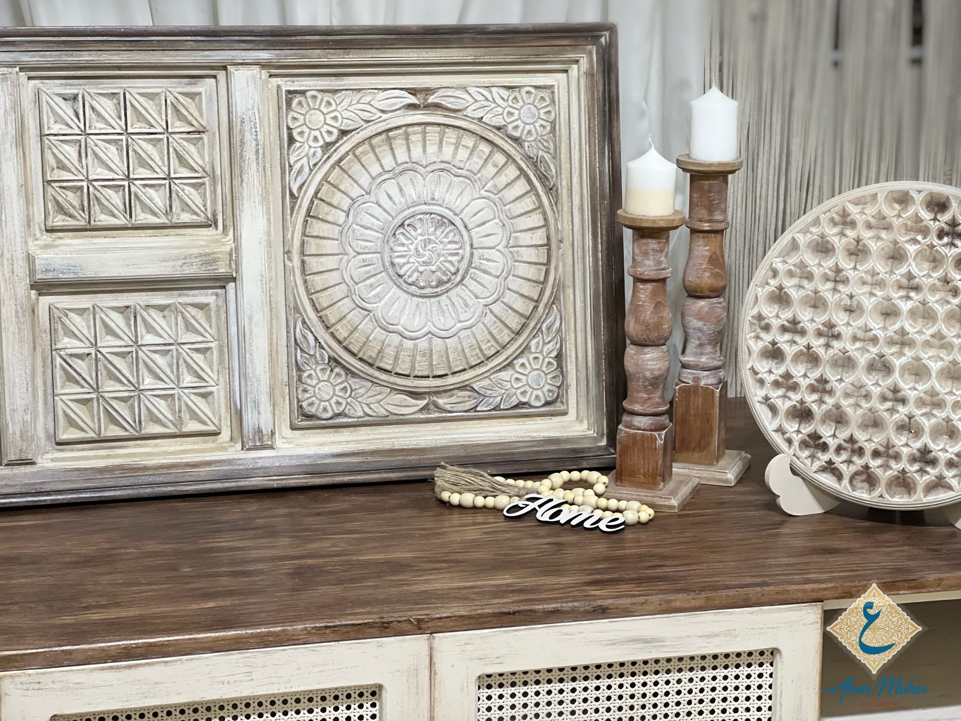 تابلوه خشبي أنيق بتصميم زخرفي مميز يضيف لمسة جمالية دافئة لأي مساحة في منزلك. مصمم بعناية وتشطيب يدوي لإبراز التفاصيل.