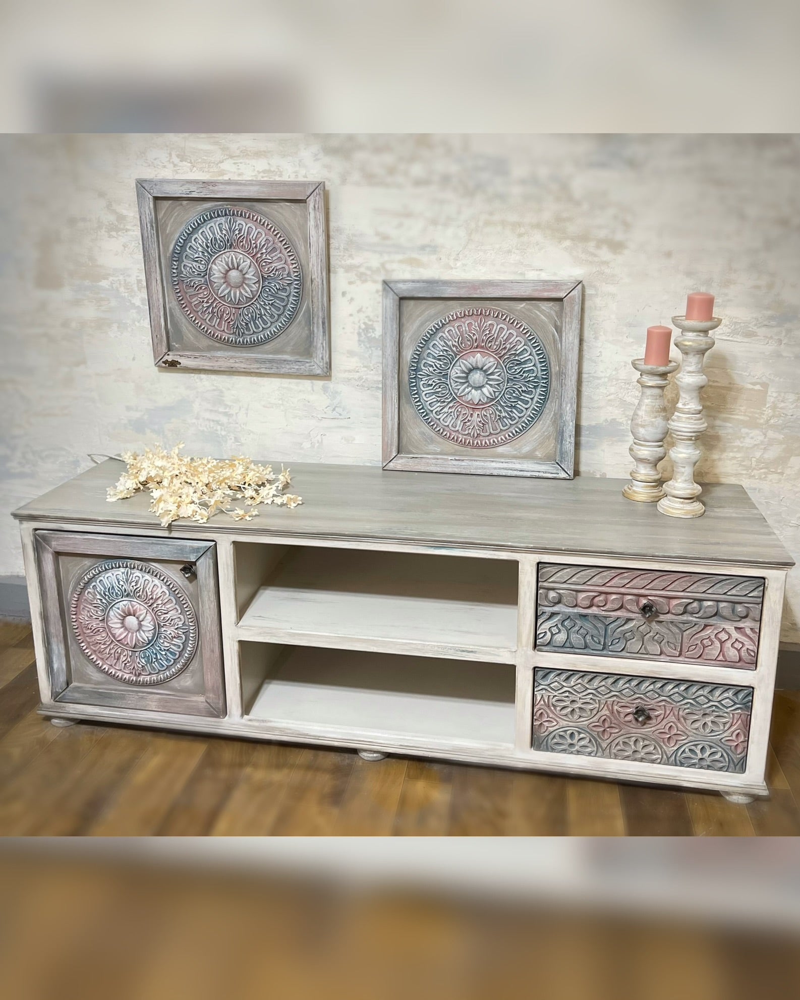 Wooden TV unit with elegant decorative details and a hand-finished look that highlights its unique craftsmanship. Combines natural wood tones with white accents to suit various interior styles.